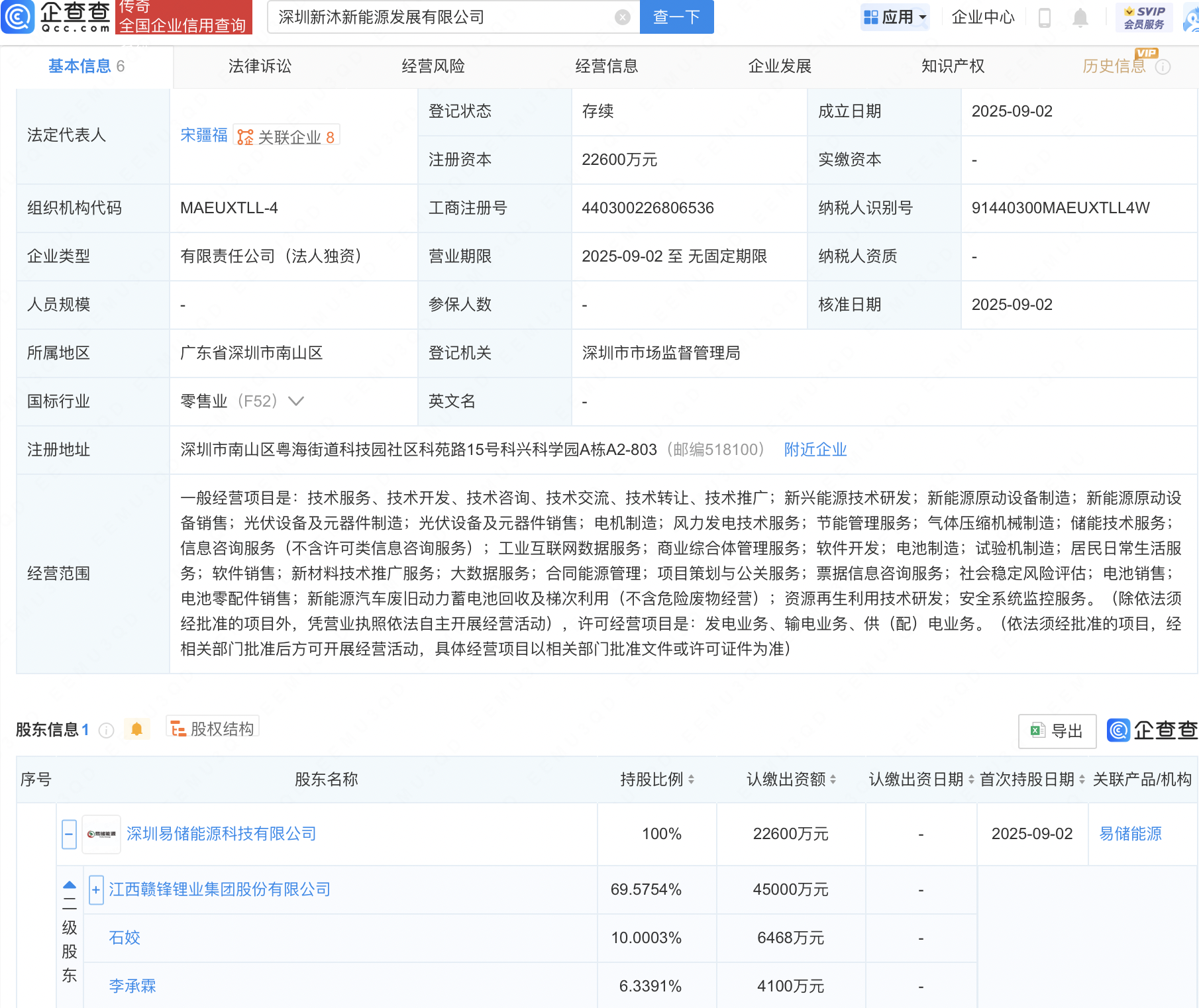 近日,深圳新沐新能源发展有限公司成立,注册资本2.26亿元,经营范围包含:工业互联网数据服务;商业综合体管理服务;软件开发;电池制造;试验机制造等。企查查股权穿透显示,该公司由赣锋锂业(002460)旗下深圳易储能源科技有限公司全资持股。