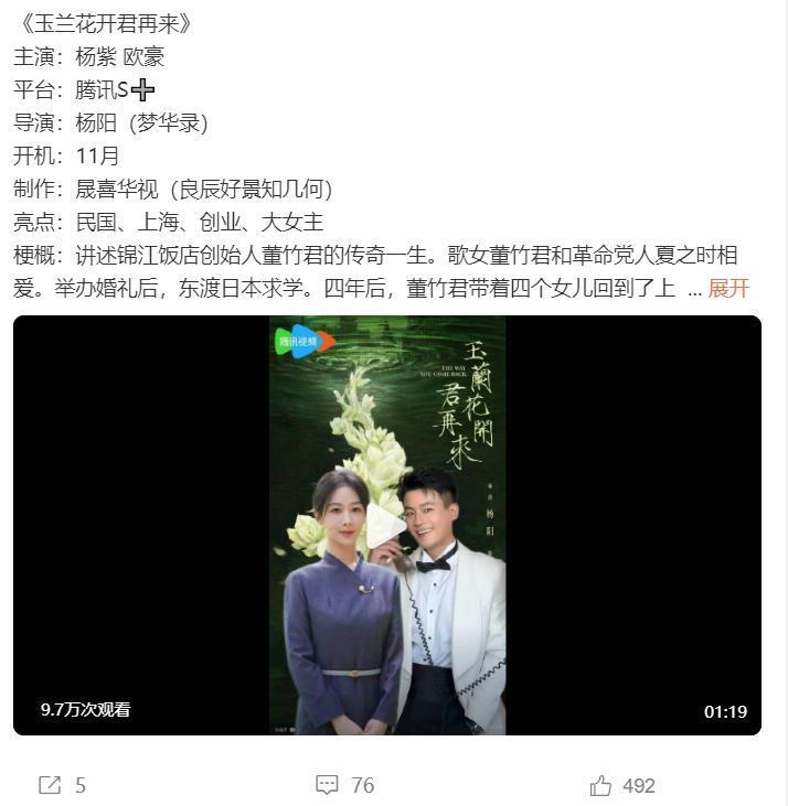 各位读者,看到网上传出的消息后,你们期待杨紫搭档欧豪出演《玉兰花开君再来》吗?你心中的男主是谁呢?