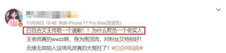 但也有部分网友指出因为白百何的发文,王传君受到了影响,白百何应该向王传君道歉。