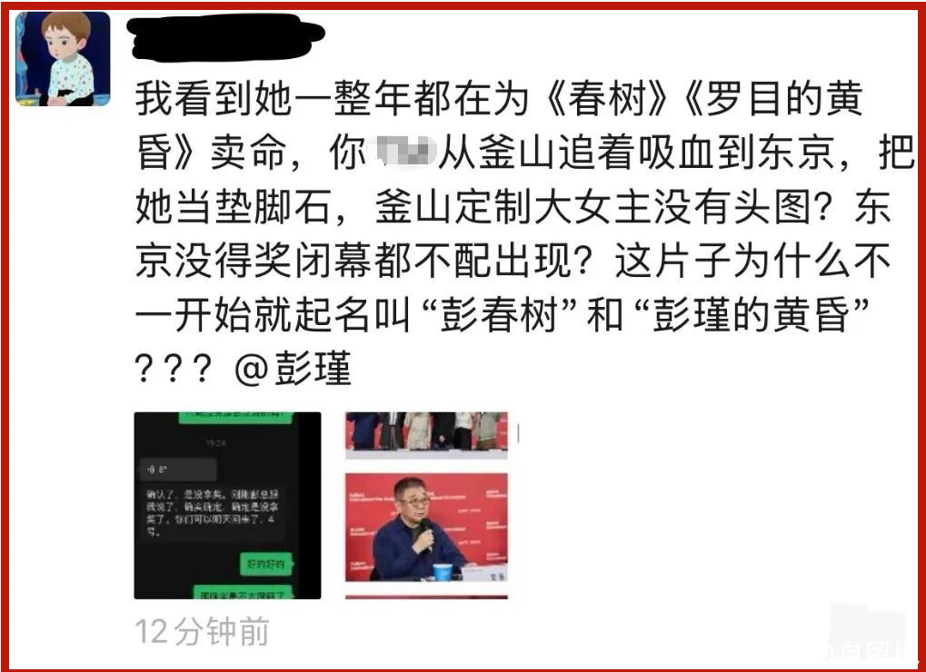 闺蜜说白百何为张律导演的《春树》《罗目的黄昏》付出了很多,结果被彭瑾当作了垫脚石,东京电影节的闭幕活动都不让白百何参加。之前去韩国釜山参加电影活动也欺负白百何。
