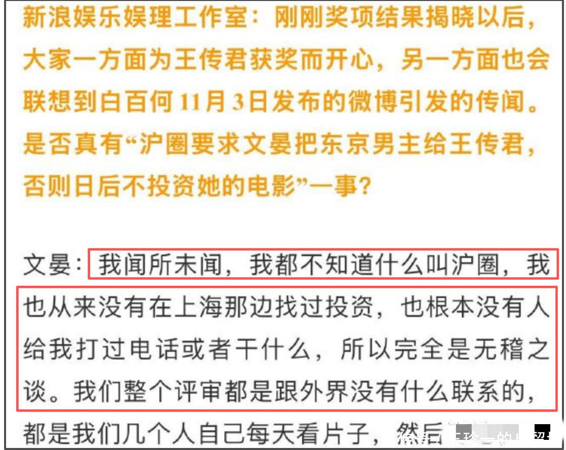 该网友还说沪圈要求东京电影节的评委文晏将影帝给王传君,否则以后不投资她的电影。
